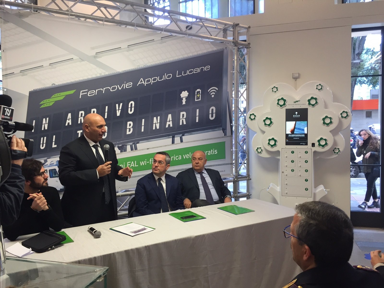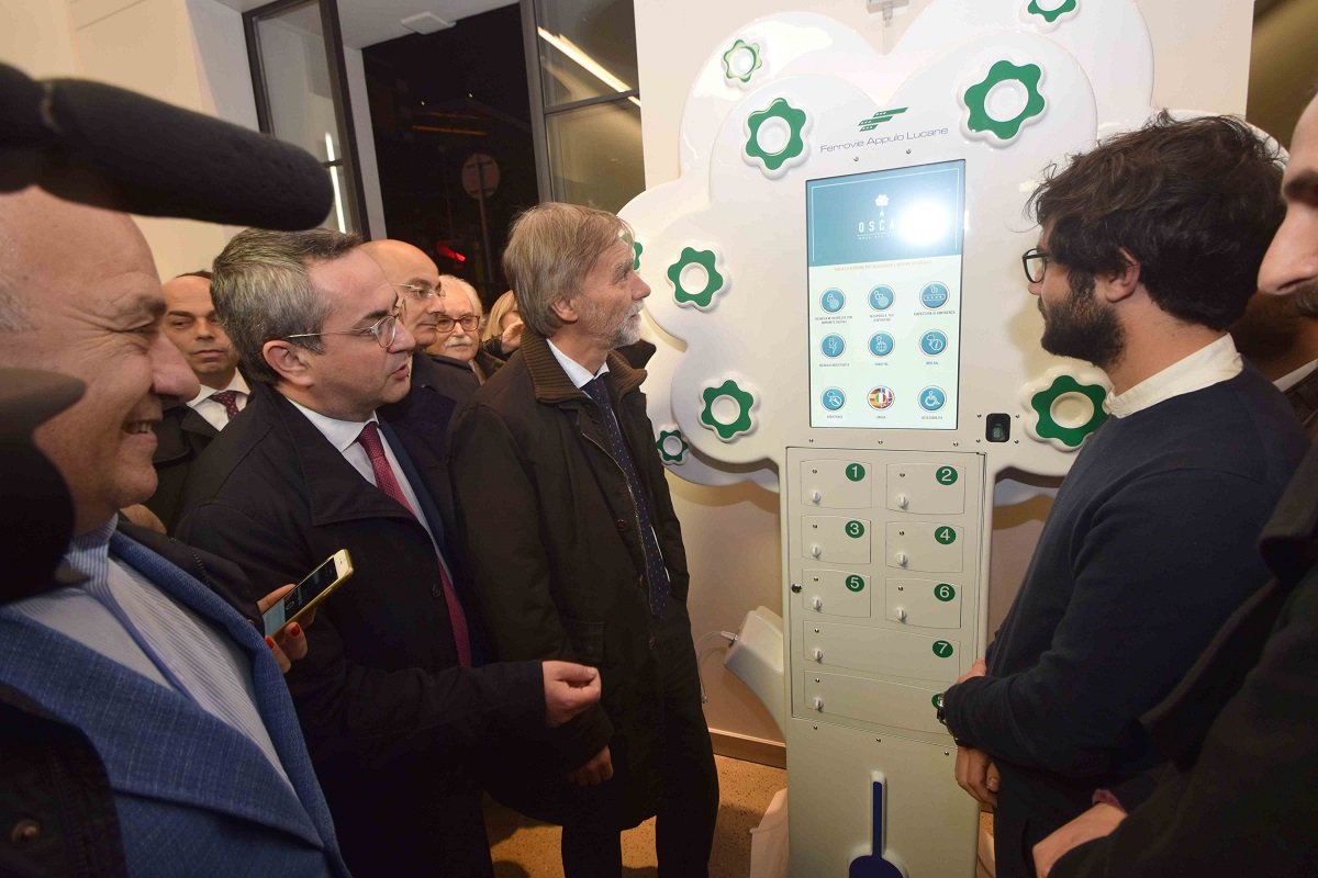 “Con questi due nuovi servizi vogliamo testimoniare la nostra grande attenzione per i giovani. In primo luogo per i giovani nostri utenti, ma anche per i giovani laureati pugliesi fondatori della start up che ha ideato Oscar ed ha vinto il bando nazionale Start & Smart. Un’idea vincente che abbiamo ritenuto importante premiare e che è nata nell’Università di Bari. Ciò ci consente anche di aprire un dialogo con l’Università che, per quanto ci riguarda, intendiamo coltivare e rendere sempre più costruttivo”. Lo ha detto il Presidente delle Ferrovie Appulo Lucane, Matteo Colamussi, durante la conferenza tenuta di questa mattina nella stazione Fal di Bari centrale insieme con il Rettore dell’Università di Bari Antonio Felice Uricchio; l’assessore regionale alla Mobilità, Giovanni Giannini; l’amministratore unico dell’azienda Energy by Oscar, Giuseppe Spadone, nella quale sono stati presentati i due nuovi servizi che Fal mette a disposizione degli utenti nelle stazioni di Bari centrale, Bari scalo, Bari Policlinico (al termine della ristrutturazione), Modugno, Grumo, Palo, Toritto, Gravina, Altamura, Matera Villalongo, Matera Centrale, Matera sud, ossia free wi-fi zone con l’attivazione della rete WI-FAL e alberelli Oscar per la ricarica in sicurezza, veloce e gratuita di smartphone e tablet. I servizi, già attivati a partire dalla stazione di Bari centrale, saranno installati ed attivati nelle altre stazioni entro fine settimana. Di Oscar, ‘collaudato’ ed apprezzato lunedì scorso dal ministro Delrio nel corso della sua visita alle Fal, ha parlato il Rettore Uricchio: “Oscar è nato nell’Università di Bari ed è un modello di sviluppo e creatività ideato da questa Start up di giovani pugliesi che ha vinto il bando del MISE e molti premi. Con Oscar, esperienza virtuosa, siamo felici di inaugurare oggi la nostra collaborazione istituzionale con Fal, un’azienda pubblica che ha fatto un percorso importante nel segno dell’innovazione”. L’assessore Giannini ha ricordato il percorso di crescita e modernizzazione aziendale di Fal: “da quando mi sono insediato nel 2013 abbiamo fatto passi da gigante, oggi Fal è un’azienda che ha rinnovato quasi per intero il parco mezzi non solo con fondi europei e regionali, ma anche con fondi propri, dimostrando che con un management che fa attività imprenditoriale seria, anche un’azienda pubblica può fare innovazione tecnologica e svolgere una funzione sociale tramite la riqualificazione di ambienti e locali di questa parte della città e tramite idee come quella della prima Velostazione del Sud Italia, che promuovono la intermodalità e la sostenibilità del trasporto locale”. L’amministratore unico di Energy By Oscar, Giuseppe Spadone ha spiegato che “Oscar è nato nel BaLab dell’Università di Bari, un laboratorio di idee e persone tramite il quale questa Università dimostra di credere ed investire nei giovani e nelle loro idee”.