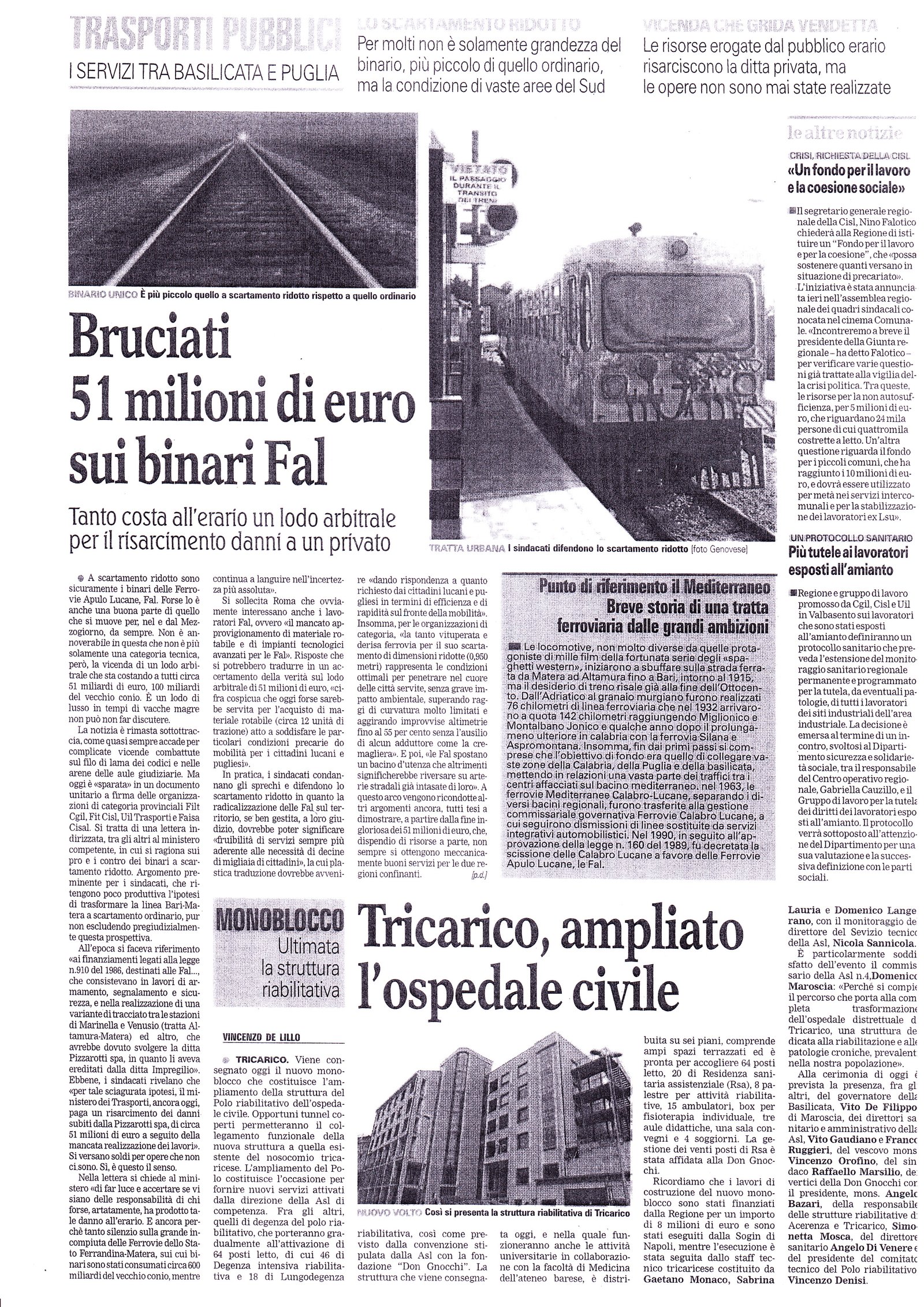 Bruciati 51 milioni di euro sui binari FAL Pubblicato il 04/12/2008 Fonte : La Gazzetta del Mezzogiorno Allegati: Scarica articolo originale Dimensioni: 5 MB
