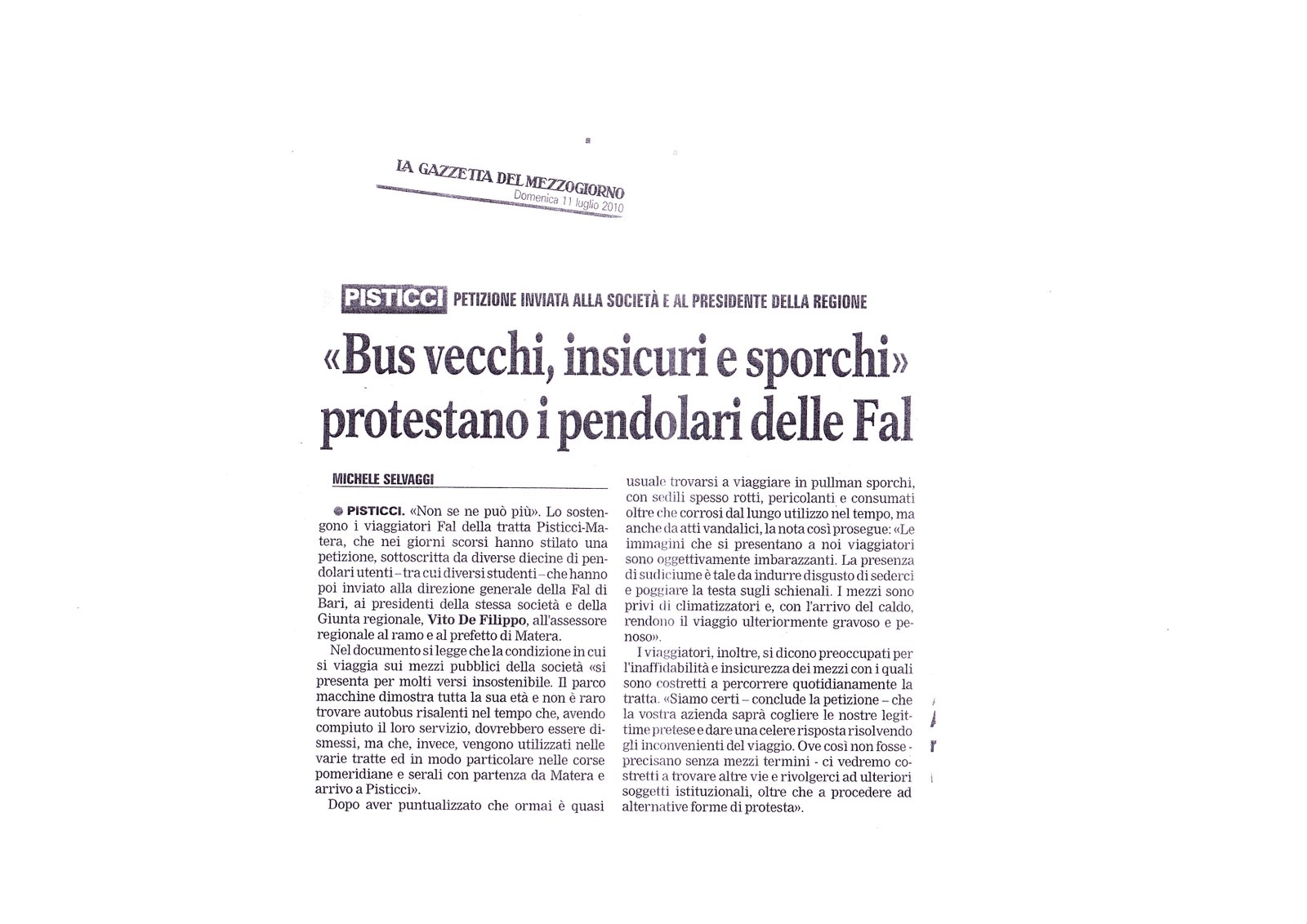 Bus vecchi, insicuri e sporchi protestano i pendolari delle FAL Pubblicato il 11/07/2010 Fonte : La Gazzetta del Mezzogiorno Allegati: Scarica articolo originale Dimensioni: 1 MB