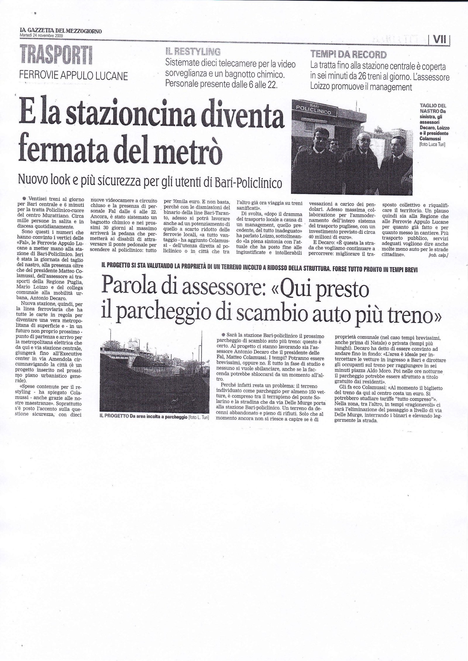 E la stazioncina diventa fermata del metrò Pubblicato il 23/11/2009 Fonte : La Gazzetta del Mezzogiorno Allegati: Scarica articolo originale Dimensioni: 791 KB