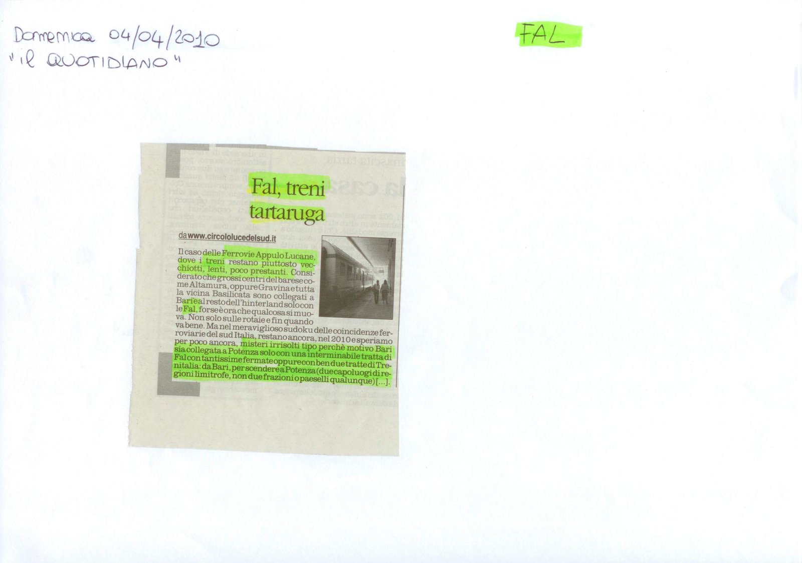 Fal, treni tartaruga Pubblicato il 03/04/2010 Fonte :il Quotidiano Allegati: Scarica articolo originale Dimensioni: 324 KB
