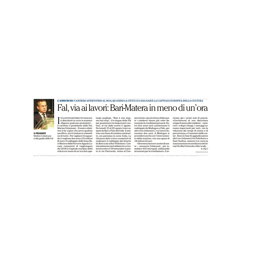 Fal via ai lavori: Matera – Bari in meno di un’ora Pubblicato il 24/08/2015 Allegati: La Repubblica Bari - 8 agosto 2015 Dimensioni: 112 KB