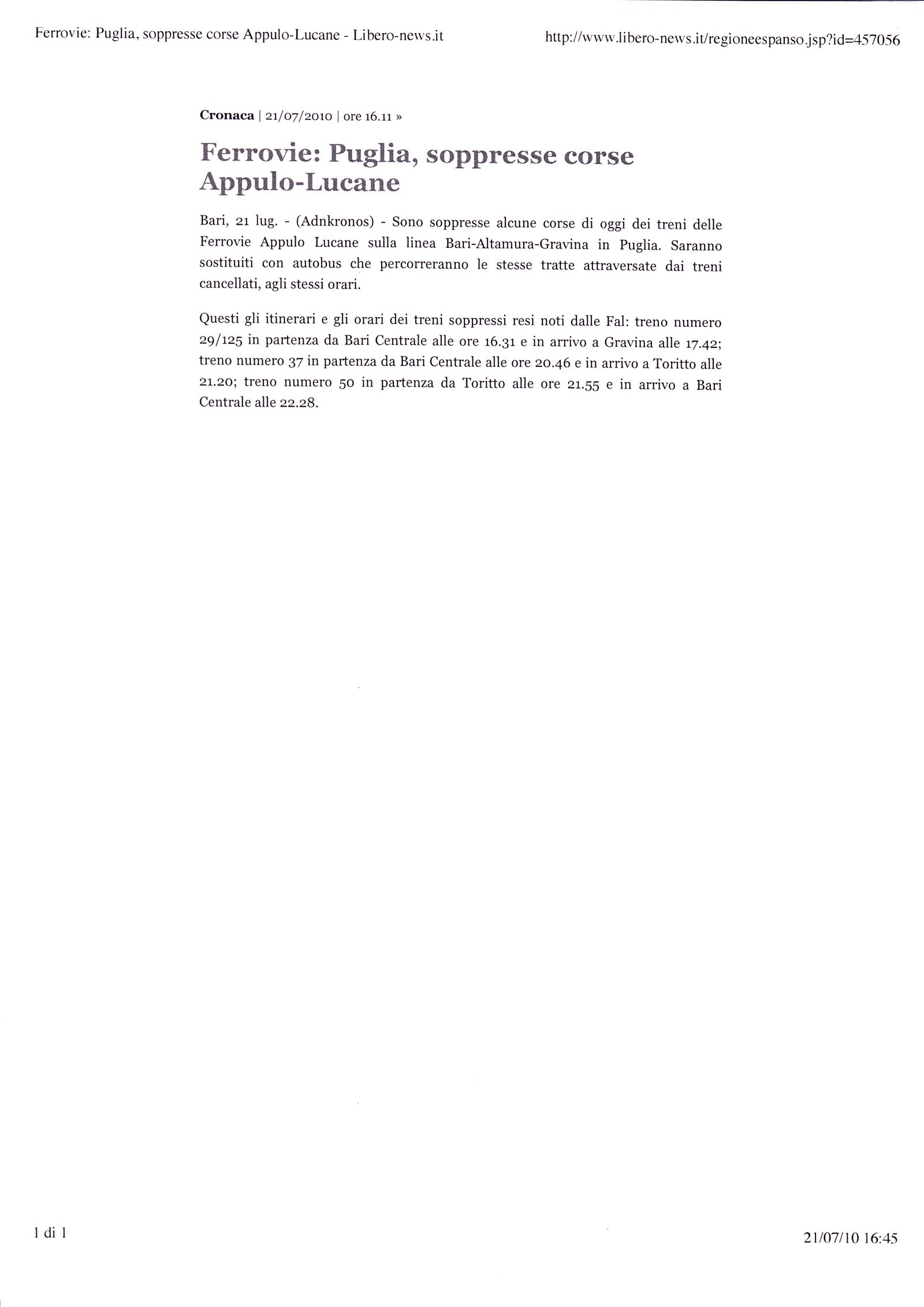 Ferrovie: Puglia, soppresse corse Appulo-Lucane Pubblicato il 21/07/2010 Fonte :Libero.it Allegati: Scarica articolo originale Dimensioni: 492 KB