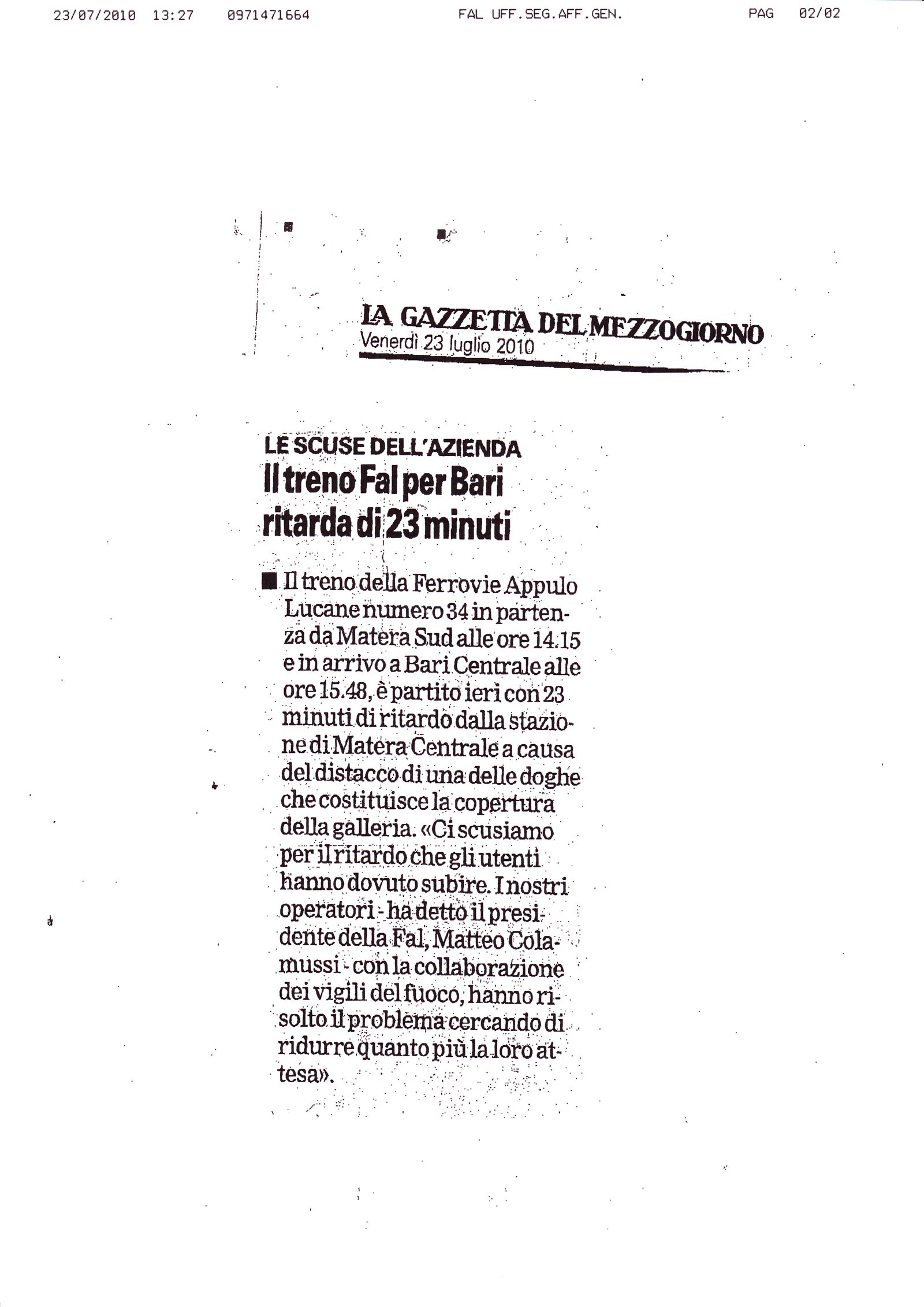 Il treno Fal per Bari ritarda di 23 minuti