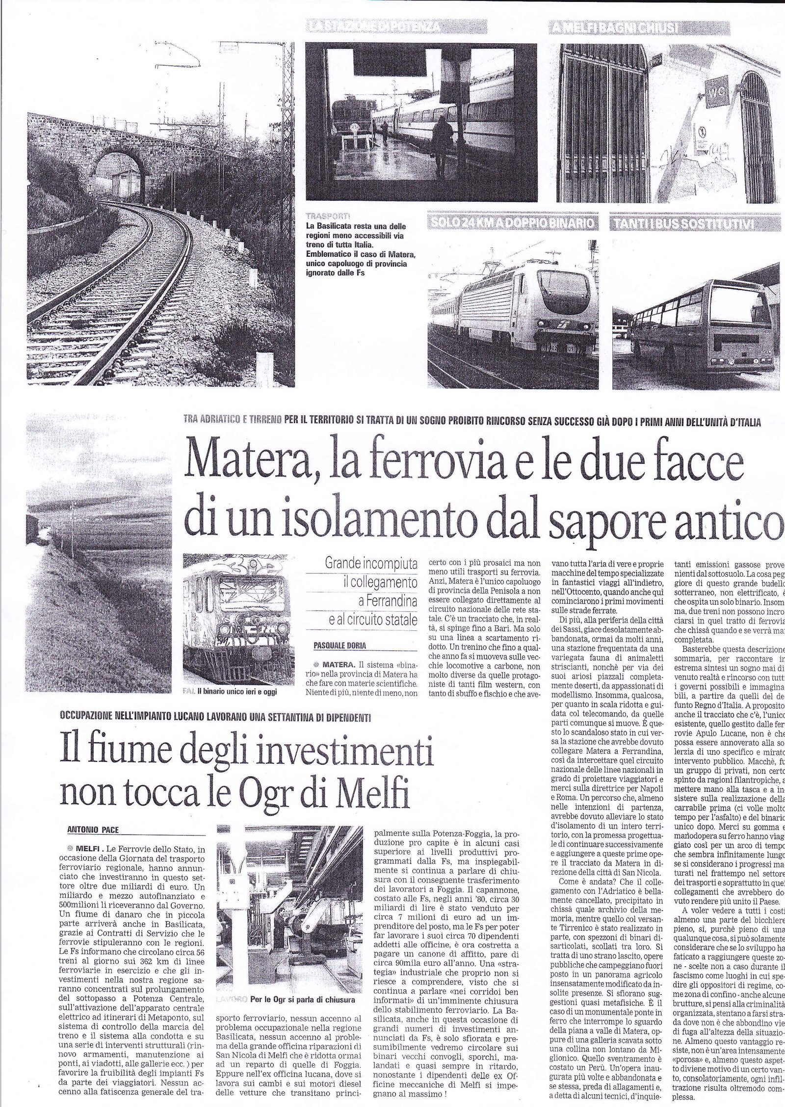 Matera, la ferrovia e le due facce di un isolamento dal sapore antico Pubblicato il 07/09/2009 Fonte : La Gazzetta del Mezzogiorno Allegati: Scarica articolo originale Dimensioni: 1 MB