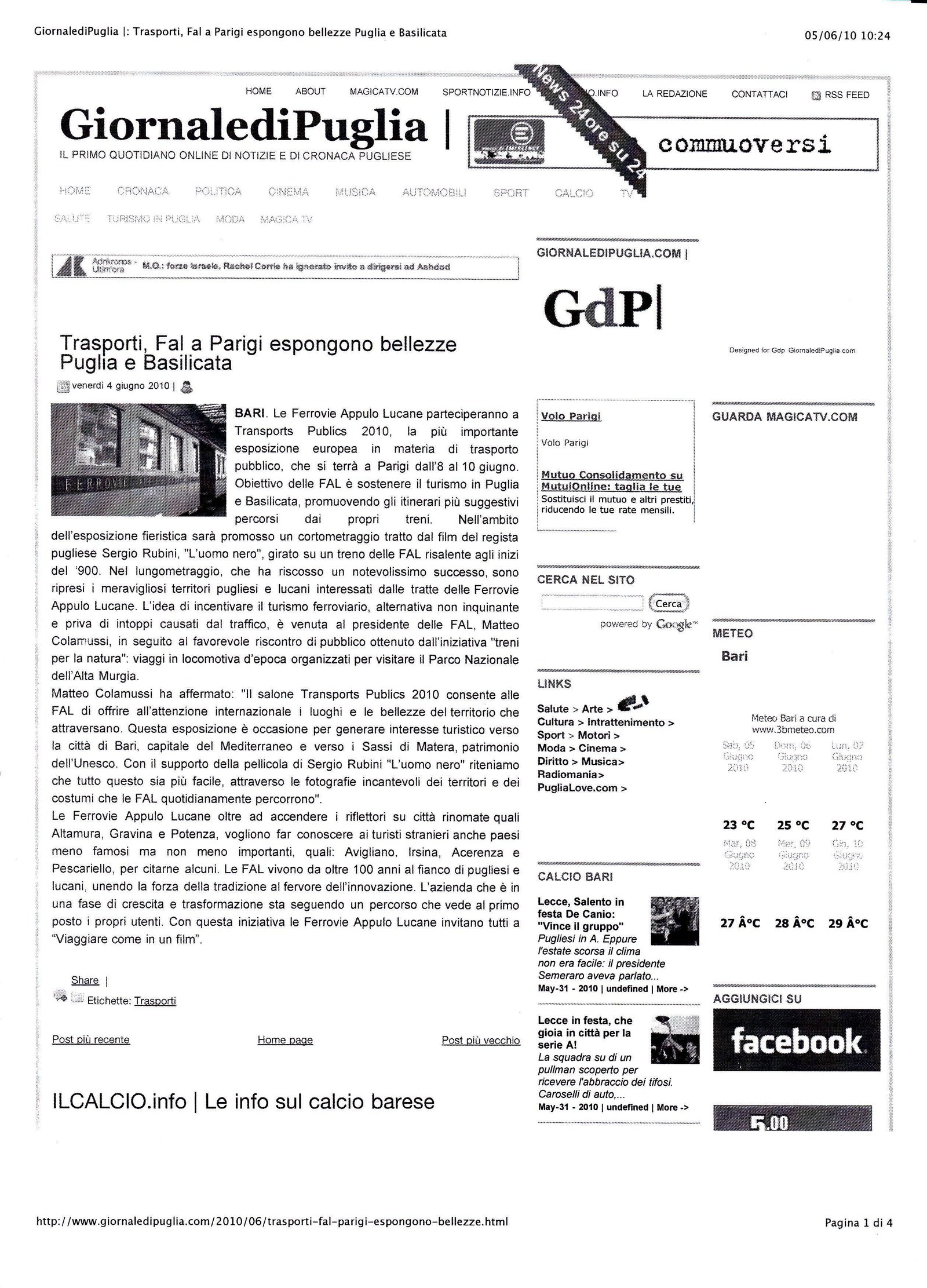 Trasporti, Fal a Parigi espongono bellezze di Puglia e Basilicata Pubblicato il 04/06/2010 Fonte : giornaledipuglia.com Allegati: Scarica articolo originale Dimensioni: 774 KB