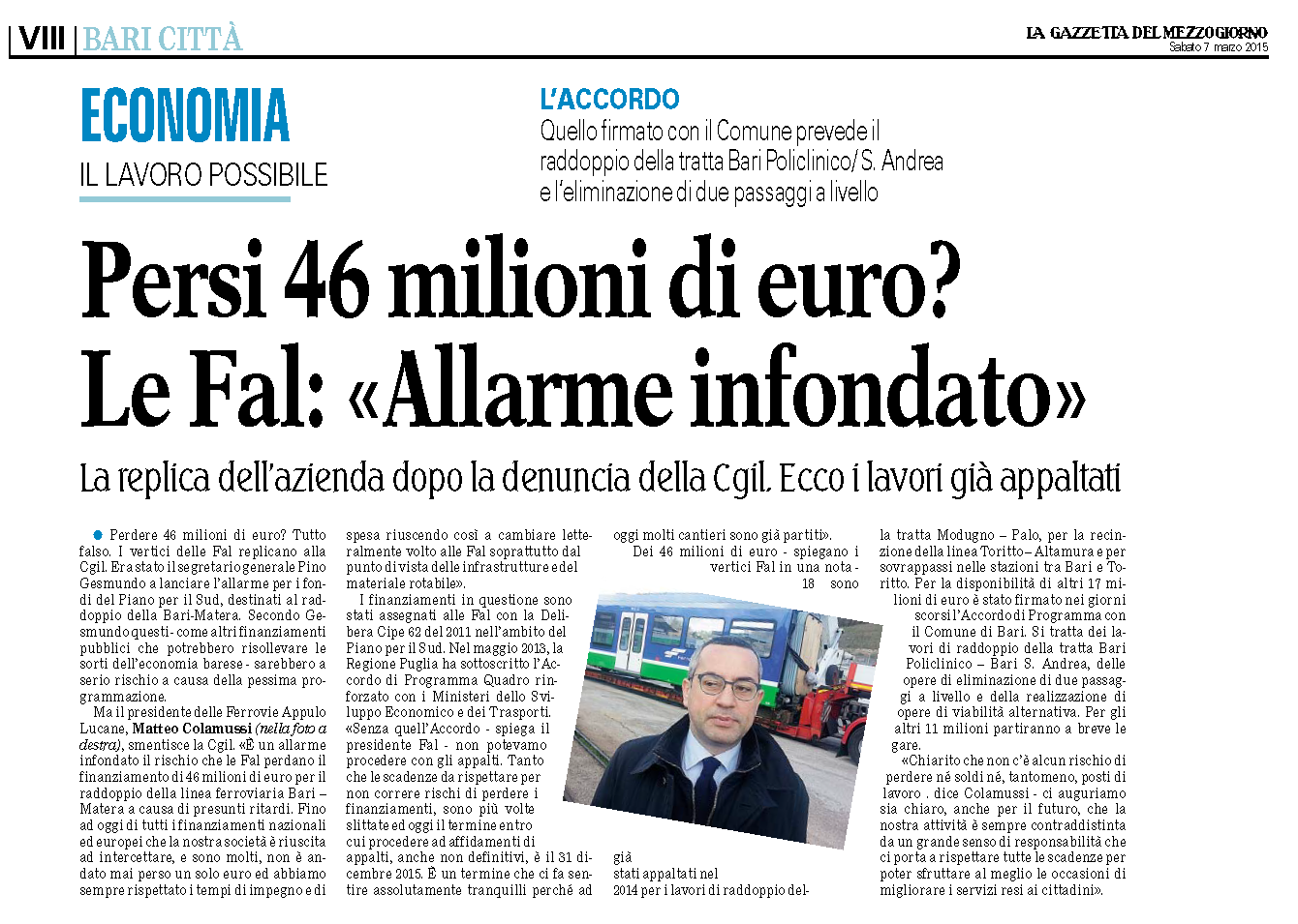 Persi 46 milioni di euro? Le Fal: allarme infondato Pubblicato il 10/03/2015 Allegati: La Gazzetta del Mezzogiorno del 7 marzo 2015 Dimensioni: 289 KB