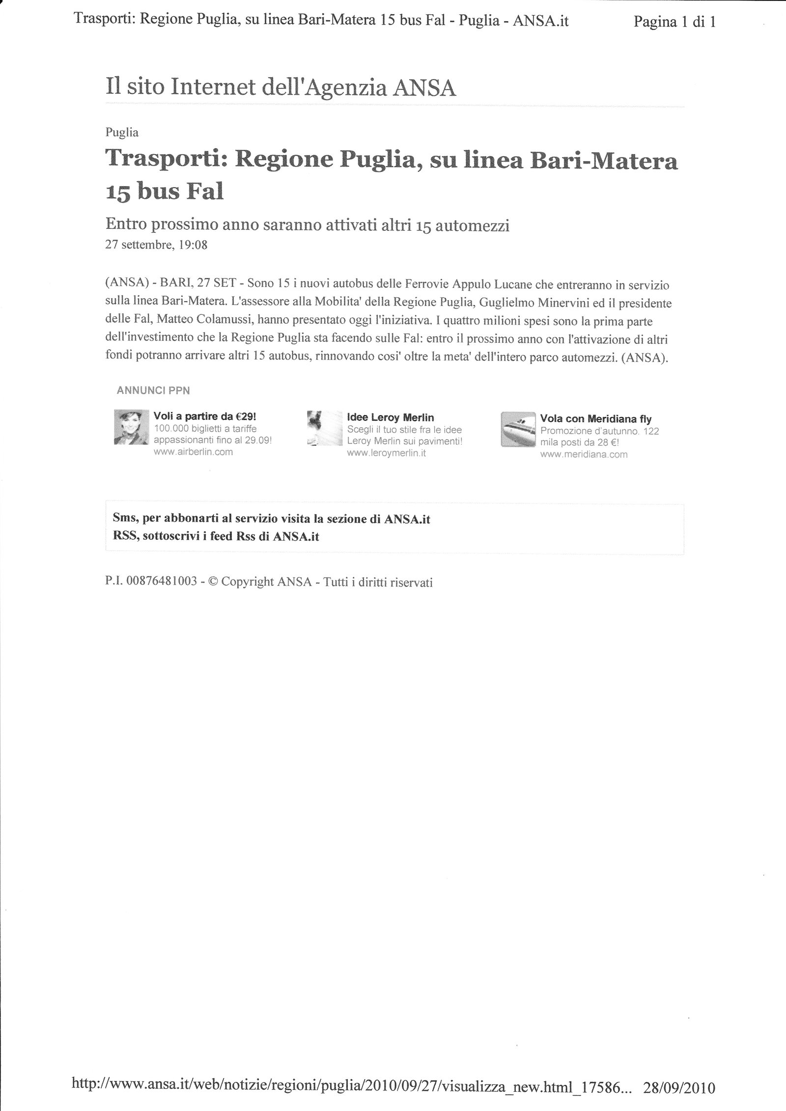 Trasporti: Regione Puglia, su linea Bari-Matera 15 bus FAL Pubblicato il 28/09/2010 Fonte : ansa.it Allegati: Scarica articolo originale Dimensioni: 529 KB